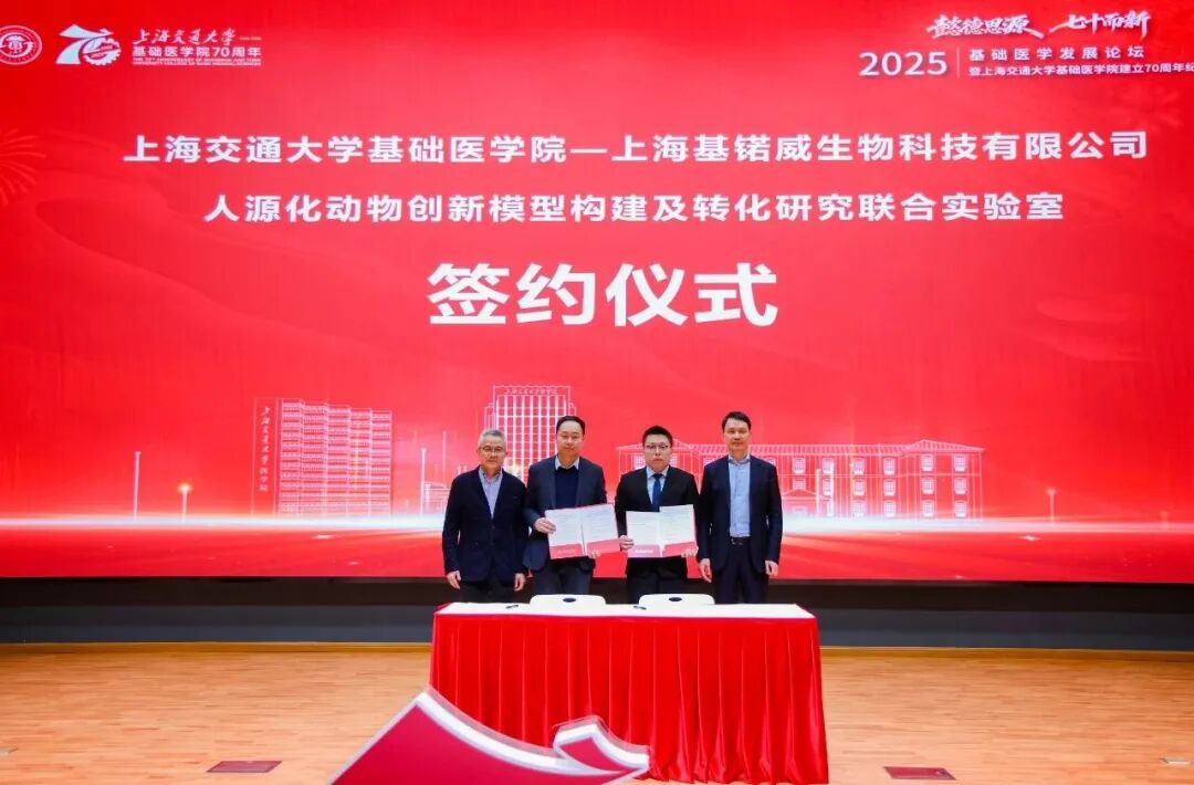 室签约仪式。 值此上海交通大学基础医学院建院70周年之际,上海基锘威生物科技有限公司与上海交通大学基础医学院正式签署共建协议,联合建设“人源化动物创新模型构建及转化研究联合实验室”。双方将充分发挥各自优势,把国际领先的人源化动物模型技术与高校深厚的基础医学研究能力紧密结合,着力构建面向原创性科研与临床前转化的高质量协同创新平台。 联合实验室将聚焦系统性人源化动物模型、关键靶点与信号通路人源化模型及复杂疾病机制研究模型的构建与应用,面向肿瘤、免疫、代谢、神经等研究领域,联合开发创新型研究工具,持续积累高质量、可复用的数据资源,为基础研究与临床前研究提供有力支撑。 此次合作充分体现了校企双方在“从0到1”原始创新链条上的高度互补。通过引入可预测性更强、与人体生理特征更为接近的人源化实验模型,有助于提升基础机制研究的准确性与可重复性;同时,来自一线科研实践的真实科学问题将反向驱动模型技术的持续迭代与本地化应用,进一步提升临床前研究的预测能力与服务水平。以“科学问题驱动模型创新,模型创新反哺基础研究”为核心理念,联合实验室将形成良性循环,为后续向药物研发与临床前研究转化奠定坚实基础。 本次合作是双方深化产学研协同创新的重要起点。未来,上海基锘威生物科技有限公司将以联合实验室建设为重要依托,高度重视并持续推进与高校、科研院所及创新型药企、生物科技公司的深度合作,不断推动基础研究走深走实、转化路径持续畅通。联合实验室将把创新活力与技术能力有机融合,为覆盖新药研发全流程的创新链条夯实研究基础。在大力推动科研成果转化的时代背景下,这种“从科学原理到技术工具,再到临床应用与产业化”的协同创新模式,将为上海乃至全国生物医药产业高质量发展注入持续动力。 上海交通大学基础医学院 上海交通大学基础医学院其前身为1955年成立的上海第二医学院基础医学部,由我国细菌学先驱余㵑教授及一批投身教学事业的前辈建立。1989年基础医学院成立,学院步入了教学与科研并驾齐驱、协同发展的阶段。2005年,上海交通大学与上海第二医科大学“强强合并”,基础医学院迎来全新机遇与舞台。积极探索并成功实践了“PI制改革”“人才特区”“学术特区”等改革试点,开启了学科重组和海外引进高层次人才的序幕。在新一代学科带头人的引领下,学院成为交大医学院在教学、科研、人才培养和社会服务领域的重要基地。 基础医学院在编职工492人,其中专任教师315人,研究生导师147人。现有特聘教授14名,课题组长85人。拥有中国科学院院士2人,国务院政府特殊津贴专家9人,国家级高层次人才计划23人,国家级青年人才计划46人,国家重点重大项目首席科学家15人。拥有一级学科博士学位授权点2个、博士后流动站2个,在院研究生 503 名。学院共有8个系、3个平台。拥有3个国家级及教育部科研基地、5个上海市研究基地。 教育强国,基础何为?基础医学院以教书育人为己任,致力于有灵魂的卓越医学创新人才培养。开展整合课程教学改革,打造一流课程,持续推进生物医学科学专业建设。2025年,基础医学院入选立德树人机制综合改革上海市试点院系。“十四五”期间,重点聚焦免疫与感染、肿瘤生物学、分子与精准医学、脑科学、代谢与衰老、干细胞与生殖医学等领域,学院科研团队在CELL、NATURE、SCIENCE等全球顶级学术期刊及子刊发表论文成为常态。在第五轮学科评估中,基础医学学科位列全国顶尖学科。