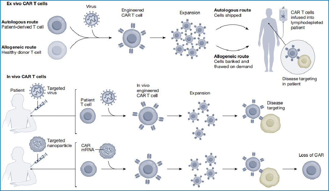 离体/体内CAR技术路线概览(Baker, Daniel J., et al. Nature 619.7971 (2023): 707-715.)