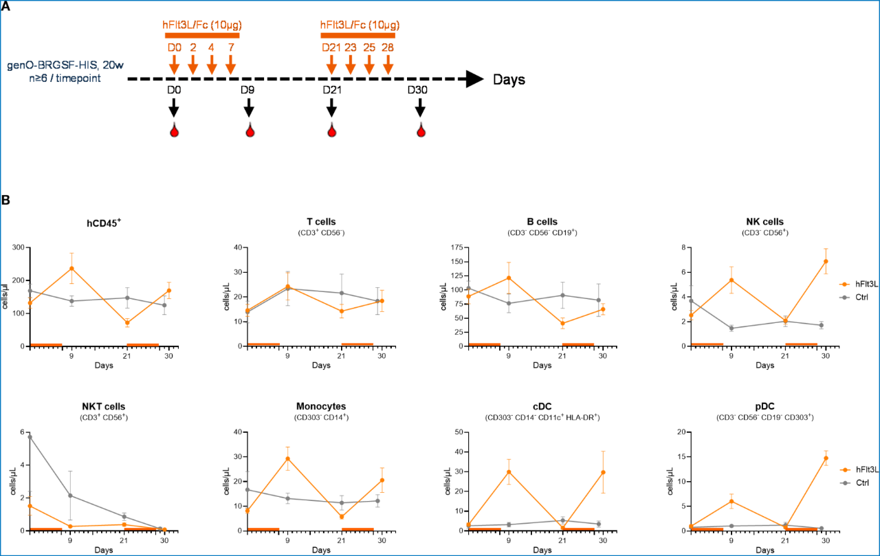 hFlt3L注射后的第2天,单核细胞、cDC和pDC数量增加,随后逐渐恢复至基线水平。进一步测试明确hFlt3L的第二轮处理同样可诱导多种髓系细胞数量的增加,cDC和pDC的数量分别增加了19倍和21倍。此外,genO-BRGSF-HIS小鼠外周血中可检测到了NK细胞,并在hFlt3L刺激后进一步上升。