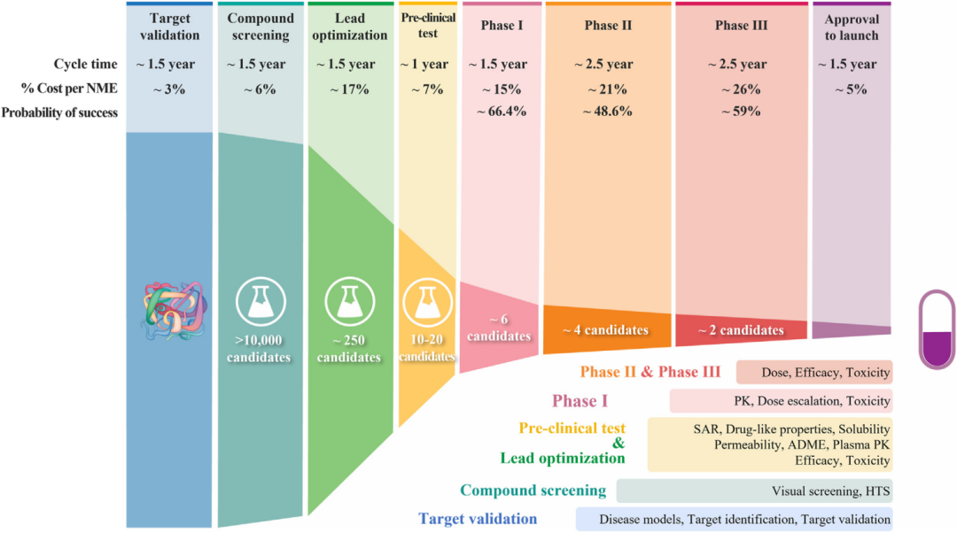 创新药研发是一个非常艰巨的过程,主要特点为周期长,成本高,特别是风险极高。据统计,超过90%的候选药物未能在临床试验中成功获批,失败原因主要包括:疗效不足,安全性问题,临床试验设计不合理,目标患者人群选择不当,转化研究失败即模型预测不足等。